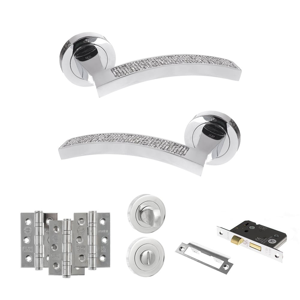Senza Pari Crystal Door Handle Pack (Bathroom Set - 2.5" CE Bathroom Lock, 3" Fire Rated Hinges x3) - Polished Chrome