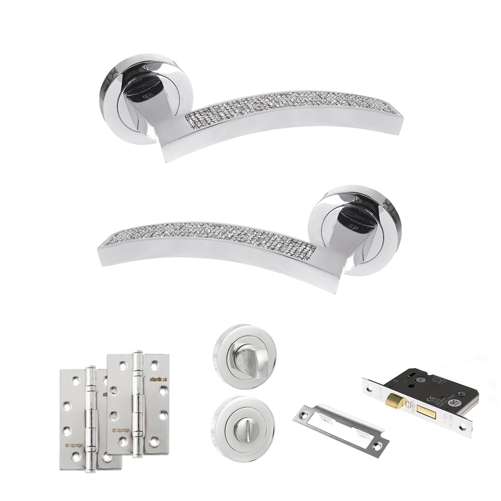 Senza Pari Crystal Door Handle Pack (Bathroom Set - 2.5" CE Bathroom Lock, 4" Slim Knuckle Hinges x2) - Polished Chrome