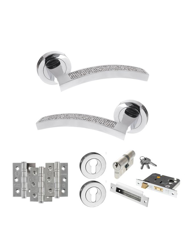 Senza Pari Crystal Door Handle Pack (Euro Lock Set - 3" CE Sashlock, 3" Fire Rated Hinges x3) - Polished Chrome
