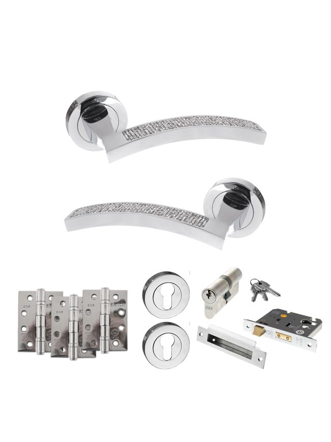 Senza Pari Crystal Door Handle Pack (Euro Lock Set - 3" CE Sashlock, 4" Fire Rated Hinges x3) - Polished Chrome