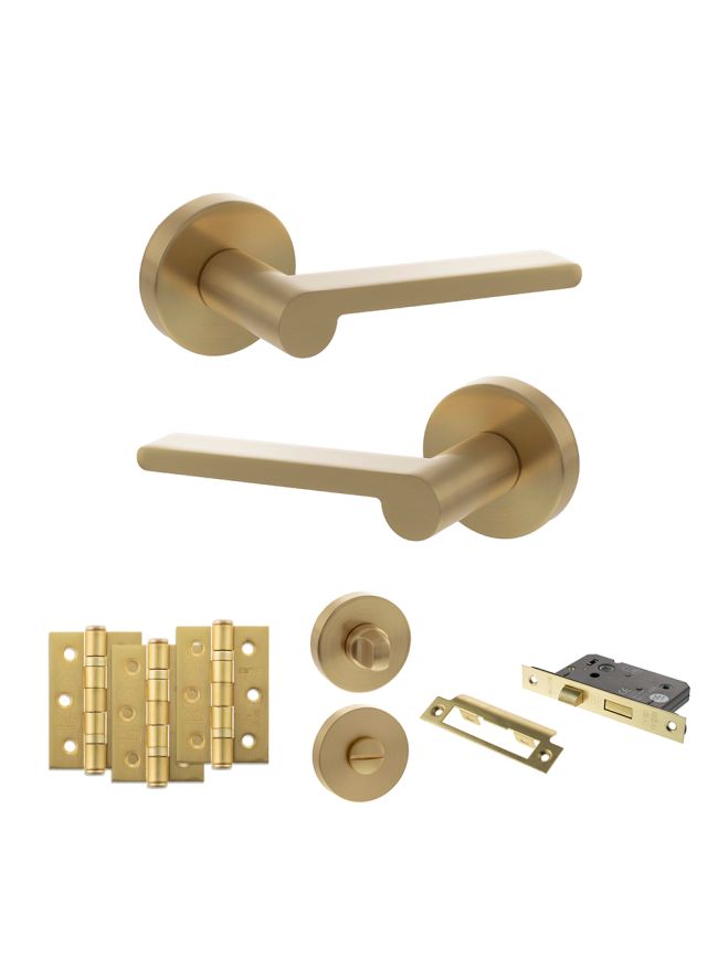 Senza Pari Darrio Door Handle Pack (Bathroom Set - 2.5" CE Bathroom Lock, 3" Fire Rated Hinges x3) - Satin Brass