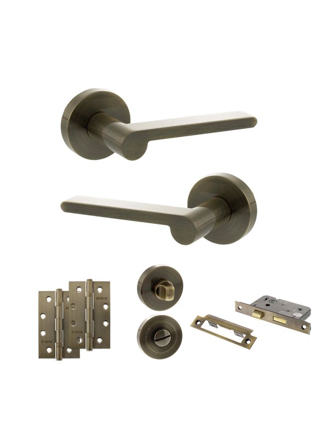 Senza Pari Darrio Door Handle Pack (Bathroom Set - 2.5" CE Bathroom Lock, 4" Slim Knuckle Hinges x2) - Antique Brass