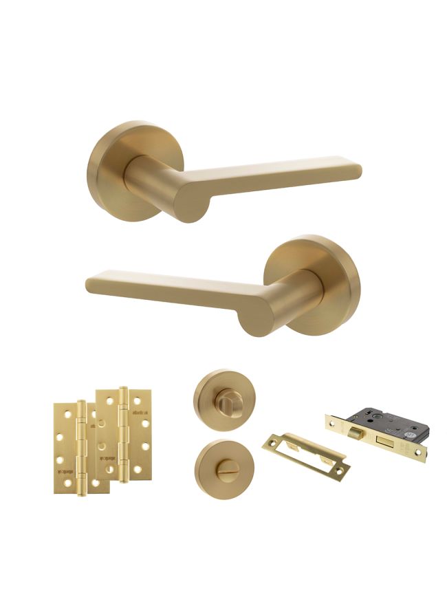 Senza Pari Darrio Door Handle Pack (Bathroom Set - 2.5" CE Bathroom Lock, 4" Slim Knuckle Hinges x2) - Satin Brass