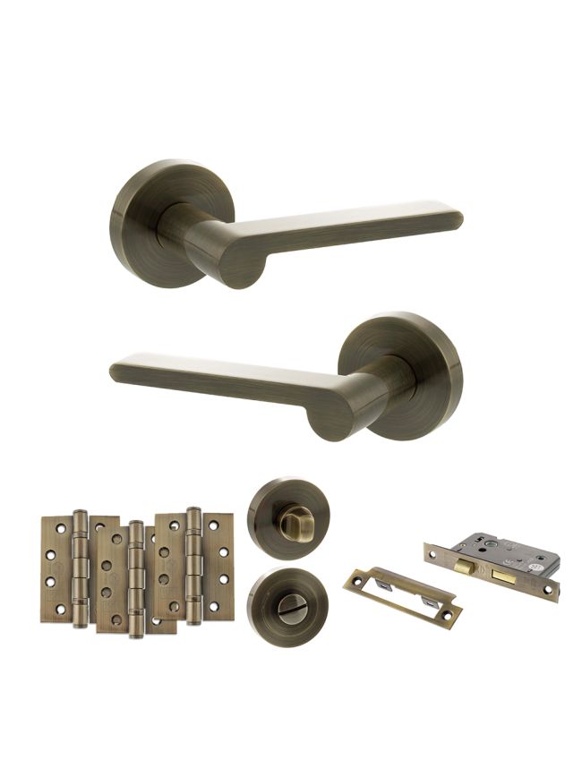 Senza Pari Darrio Door Handle Pack (Bathroom Set - 3" CE Bathroom Lock, 4" Fire Rated Hinges x3) - Antique Brass