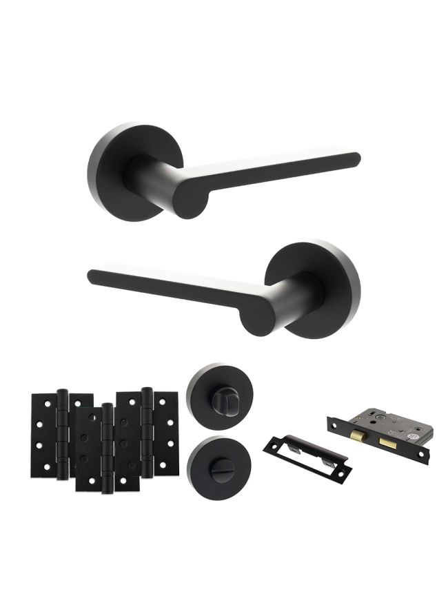 Senza Pari Darrio Door Handle Pack (Bathroom Set - 3" CE Bathroom Lock, 4" Fire Rated Hinges x3) - Matt Black