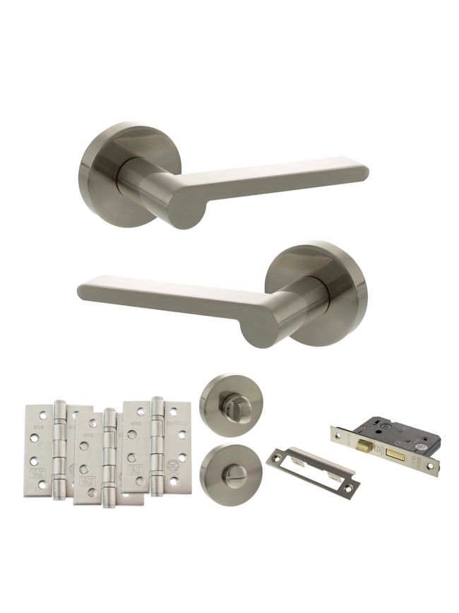 Senza Pari Darrio Door Handle Pack (Bathroom Set - 3" CE Bathroom Lock, 4" Fire Rated Hinges x3) - Satin Nickel