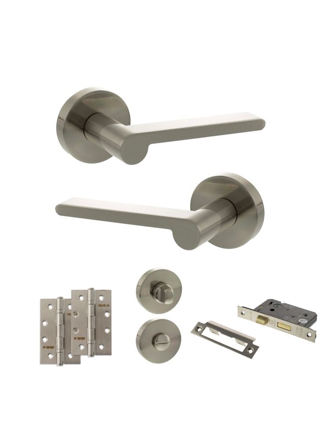 Senza Pari Darrio Door Handle Pack (Bathroom Set - 3" CE Bathroom Lock, 4" Slim Knuckle Hinges x2) - Satin Nickel
