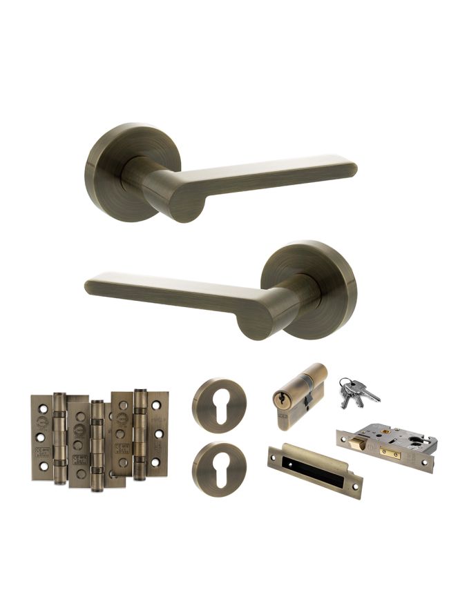 Senza Pari Darrio Door Handle Pack (Euro Lock Set - 3" CE Sashlock, 3" Fire Rated Hinges x3) - Antique Brass
