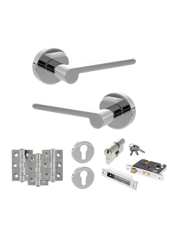 Senza Pari Darrio Door Handle Pack (Euro Lock Set - 3" CE Sashlock, 3" Fire Rated Hinges x3) - Polished Chrome