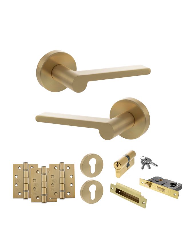 Senza Pari Darrio Door Handle Pack (Euro Lock Set - 3" CE Sashlock, 4" Fire Rated Hinges x3) - Satin Brass