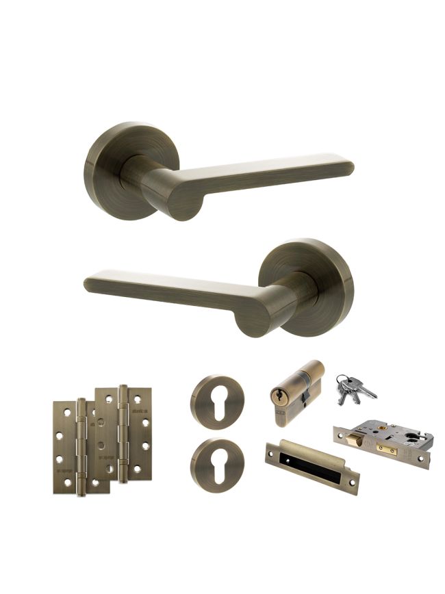 Senza Pari Darrio Door Handle Pack (Euro Lock Set - 3" CE Sashlock, 4" Slim Knuckle Hinges x2) - Antique Brass