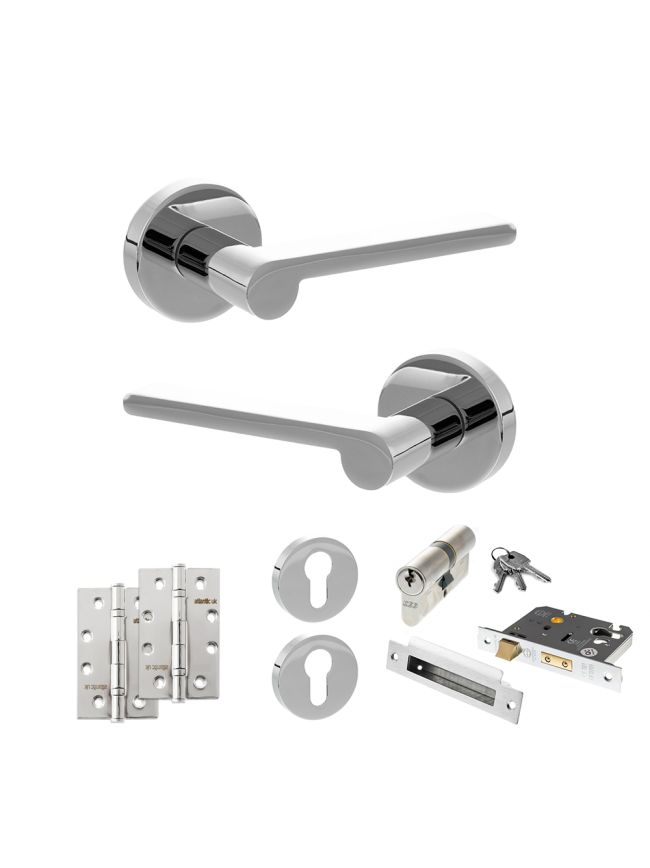 Senza Pari Darrio Door Handle Pack (Euro Lock Set - 3" CE Sashlock, 4" Slim Knuckle Hinges x2) - Polished Chrome