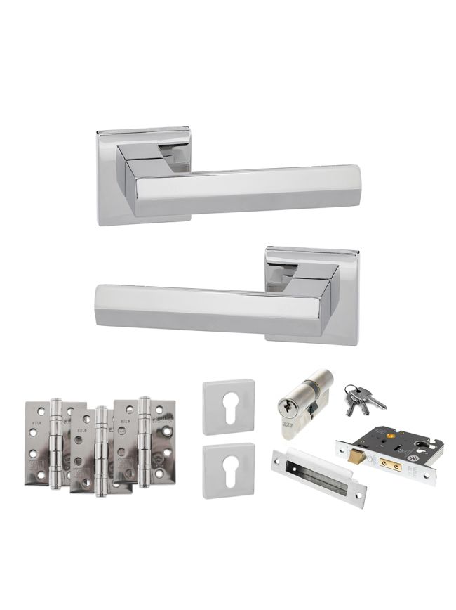 Senza Pari Davoli Door Handle Pack (Euro Lock Set - 3" CE Sashlock, 4" Fire Rated Hinges x3) - Polished Chrome