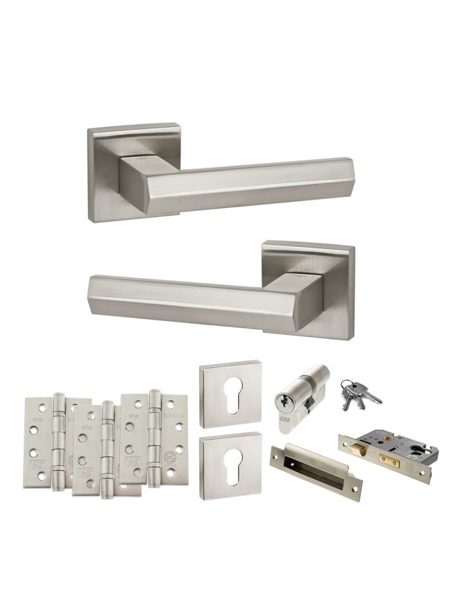 • A high security option for use on internal doors you’d like to lock with a key such as offices or internal porches. It comes with a pair of handles, Euro sashlock, 5 pin Euro cylinder, 3 keys, 2 Euro escutcheons and hinges.