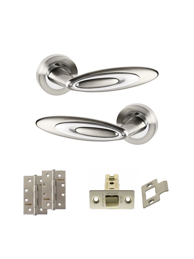 Senza Pari Elisse Door Handle Pack (Latch Set - 3" CE Latch, 4" Slim Knuckle Hinges x2) - Satin Nickel/Chrome Plate
