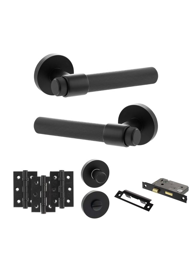 Senza Pari Fasana Door Handle Pack (Bathroom Set - 3" CE Bathroom Lock, 3" Fire Rated Hinges x3) - Matt Black
