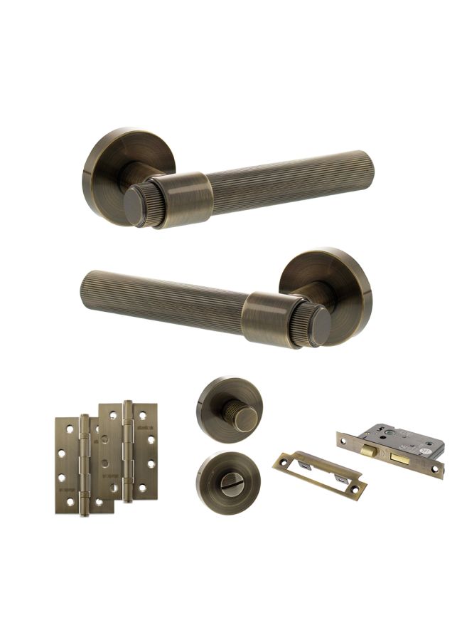 Senza Pari Fasana Door Handle Pack (Bathroom Set - 3" CE Bathroom Lock, 4" Slim Knuckle Hinges x2) - Antique Brass
