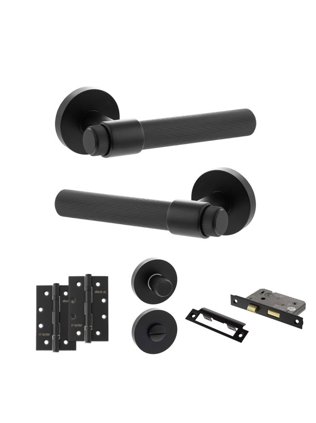Senza Pari Fasana Door Handle Pack (Bathroom Set - 3" CE Bathroom Lock, 4" Slim Knuckle Hinges x2) - Matt Black