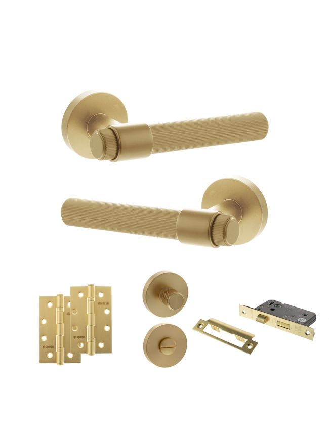 Senza Pari Fasana Door Handle Pack (Bathroom Set - 3" CE Bathroom Lock, 4" Slim Knuckle Hinges x2) - Satin Brass