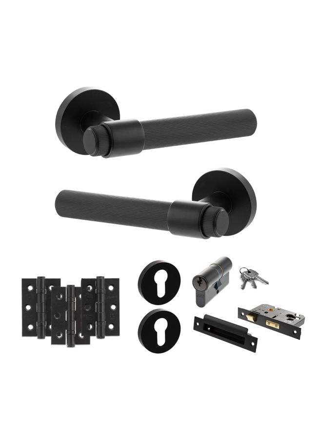 Senza Pari Fasana Door Handle Pack (Euro Lock Set - 3" CE Sashlock, 3" Fire Rated Hinges x3) - Matt Black