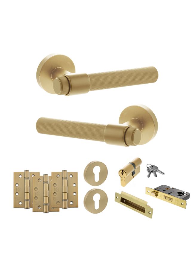 Senza Pari Fasana Door Handle Pack (Euro Lock Set - 3" CE Sashlock, 4" Fire Rated Hinges x3) - Satin Brass