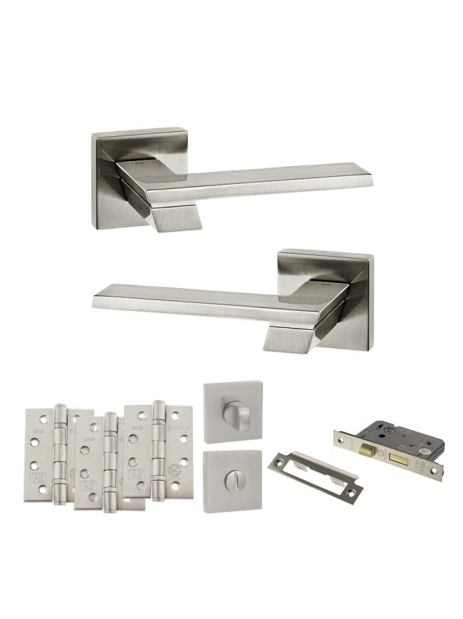 Senza Pari Giovanni Door Handle Pack (Bathroom Set - 3" CE Bathroom Lock, 4" Fire Rated Hinges x3) - Satin Nickel