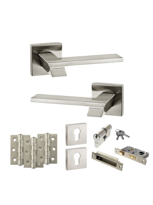 Senza Pari Giovanni Door Handle Pack (Euro Lock Set - 3" CE Sashlock, 3" Fire Rated Hinges x3) - Satin Nickel