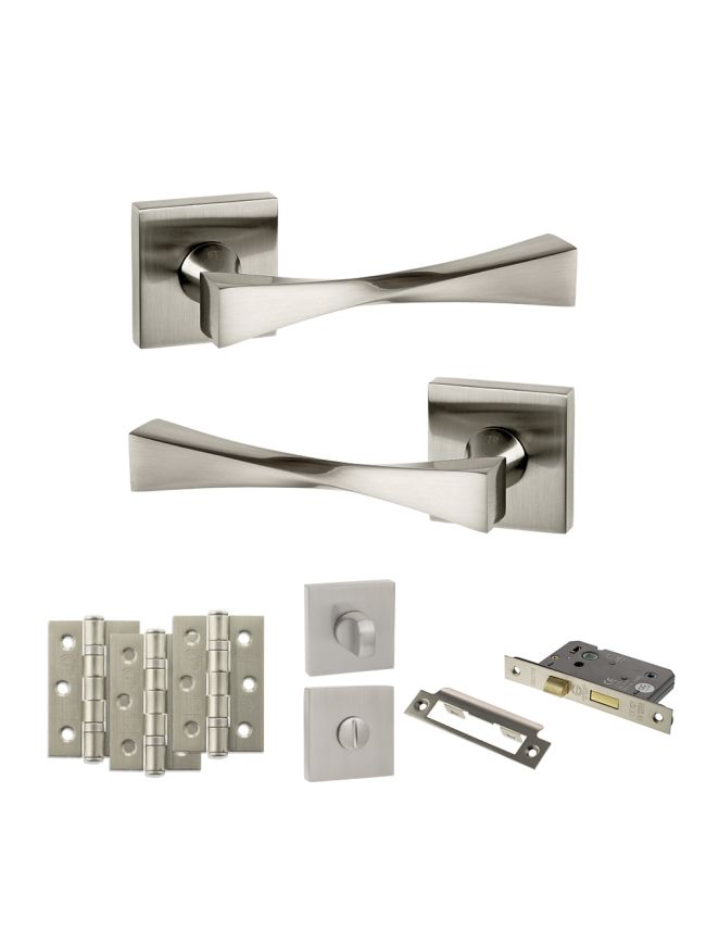 Senza Pari Guido Door Handle Pack (Bathroom Set - 3" CE Bathroom Lock, 3" Fire Rated Hinges x3) - Satin Nickel