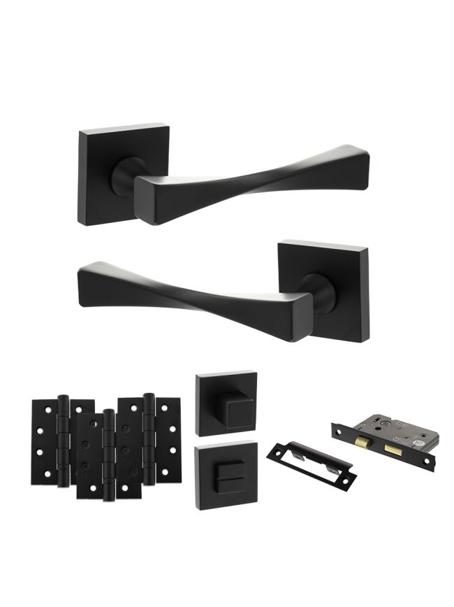Senza Pari Guido Door Handle Pack (Bathroom Set - 3" CE Bathroom Lock, 4" Fire Rated Hinges x3) - Matt Black