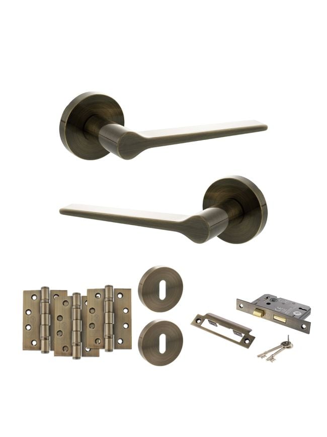 Senza Pari Laviano Door Handle Pack (3 Lever Lock Set - 3" CE Sashlock, 4" Fire Rated Hinges x3) - Antique Brass