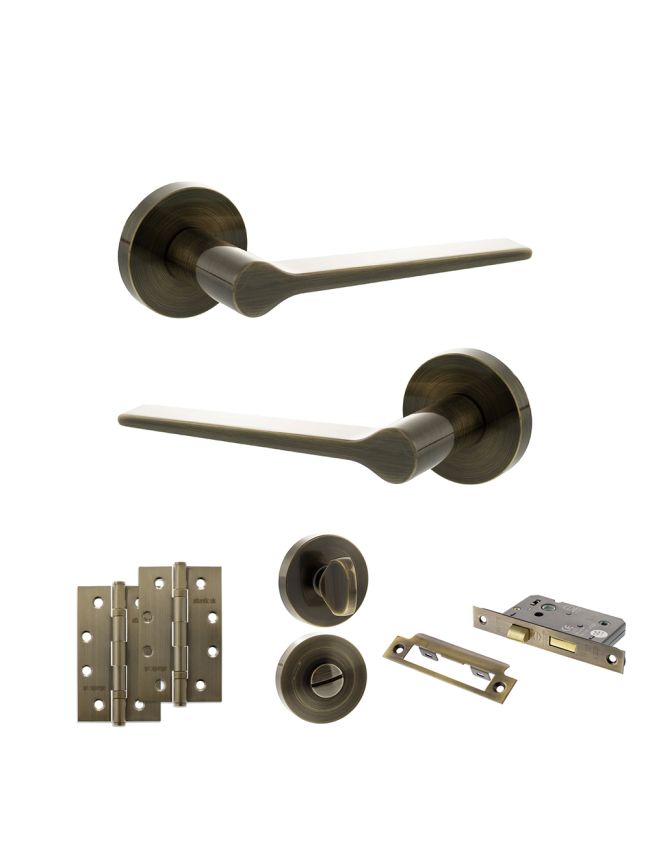 Senza Pari Laviano Door Handle Pack (Bathroom Set - 2.5" CE Bathroom Lock, 4" Slim Knuckle Hinges x2) - Antique Brass