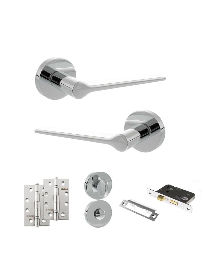 Senza Pari Laviano Door Handle Pack (Bathroom Set - 3" CE Bathroom Lock, 4" Slim Knuckle Hinges x2) - Polished Chrome