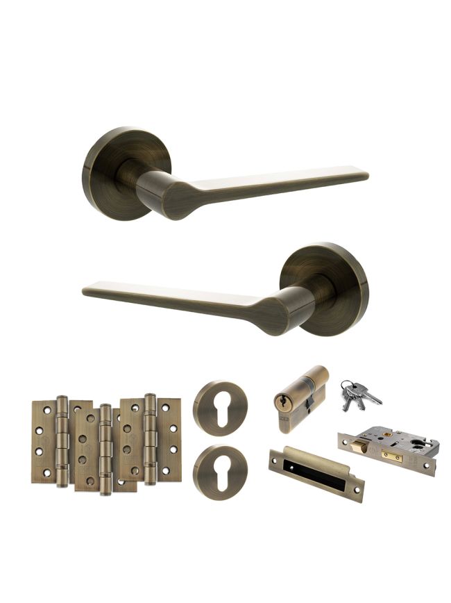 Senza Pari Laviano Door Handle Pack (Euro Lock Set - 2.5" CE Sashlock, 4" Fire Rated Hinges x3) - Antique Brass
