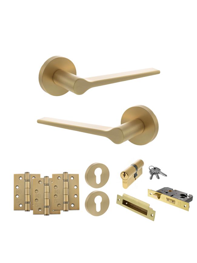 Senza Pari Laviano Door Handle Pack (Euro Lock Set - 3" CE Sashlock, 4" Fire Rated Hinges x3) - Satin Brass