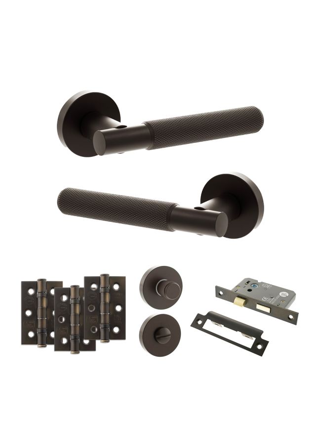 Senza Pari Rosarno Door Handle Pack (Bathroom Set - 3" CE Bathroom Lock, 3" Fire Rated Hinges x3) - Urban Dark Bronze