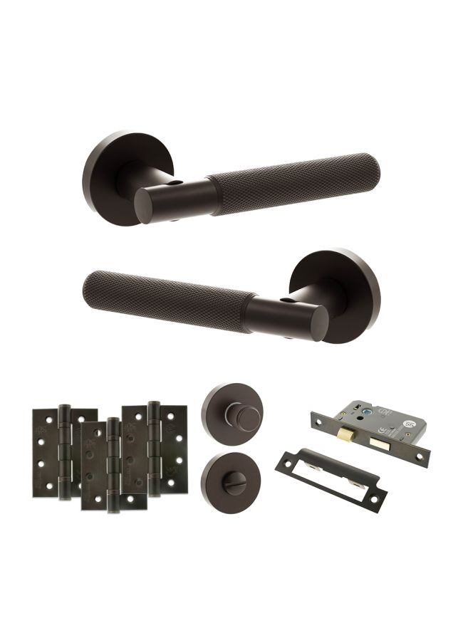 Senza Pari Rosarno Door Handle Pack (Bathroom Set - 3" CE Bathroom Lock, 4" Fire Rated Hinges x3) - Urban Dark Bronze