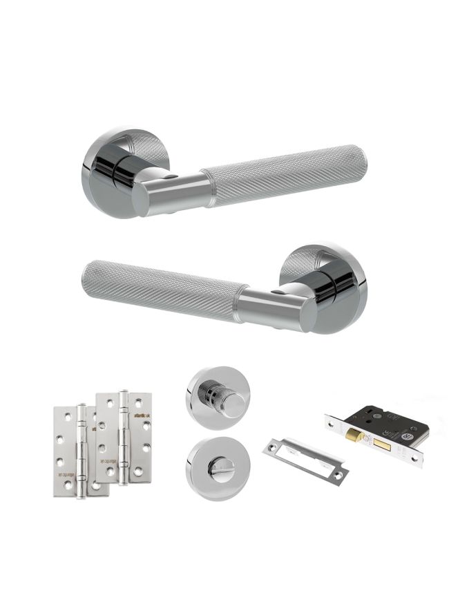 Senza Pari Rosarno Door Handle Pack (Bathroom Set - 3" CE Bathroom Lock, 4" Slim Knuckle Hinges x2) - Polished Chrome