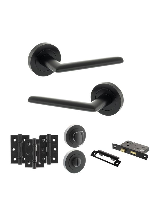 STATUS Alabama Door Handle Pack (Bathroom Set - 2.5" CE Bathroom Lock, 3" Fire Rated Hinges x3) - Matt Black
