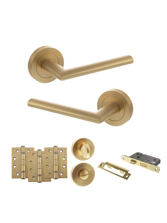 STATUS Alabama Door Handle Pack (Bathroom Set - 3" CE Bathroom Lock, 4" Fire Rated Hinges x3) - Satin Brass