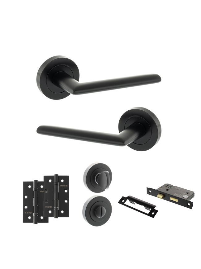 STATUS Alabama Door Handle Pack (Bathroom Set - 3" CE Bathroom Lock, 4" Slim Knuckle Hinges x2) - Matt Black
