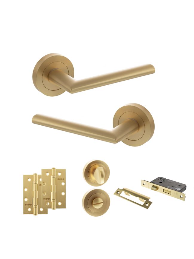 STATUS Alabama Door Handle Pack (Bathroom Set - 3" CE Bathroom Lock, 4" Slim Knuckle Hinges x2) - Satin Brass