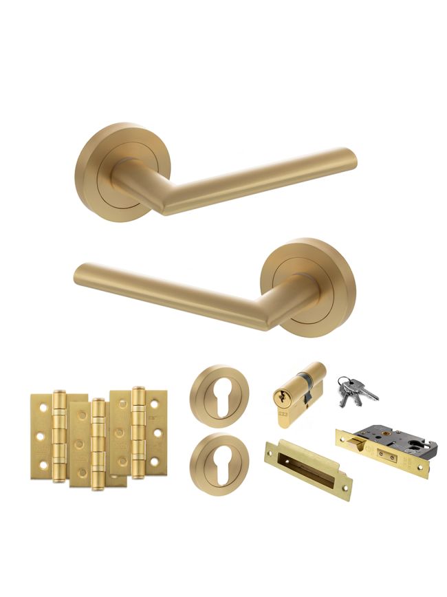 STATUS Alabama Door Handle Pack (Euro Lock Set - 2.5" CE Sashlock, 3" Fire Rated Hinges x3) - Satin Brass