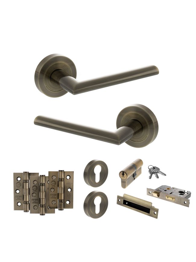 STATUS Alabama Door Handle Pack (Euro Lock Set - 3" CE Sashlock, 3" Fire Rated Hinges x3) - Antique Brass