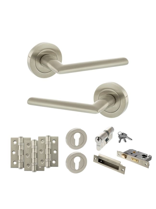 STATUS Alabama Door Handle Pack (Euro Lock Set - 3" CE Sashlock, 3" Fire Rated Hinges x3) - Satin Nickel