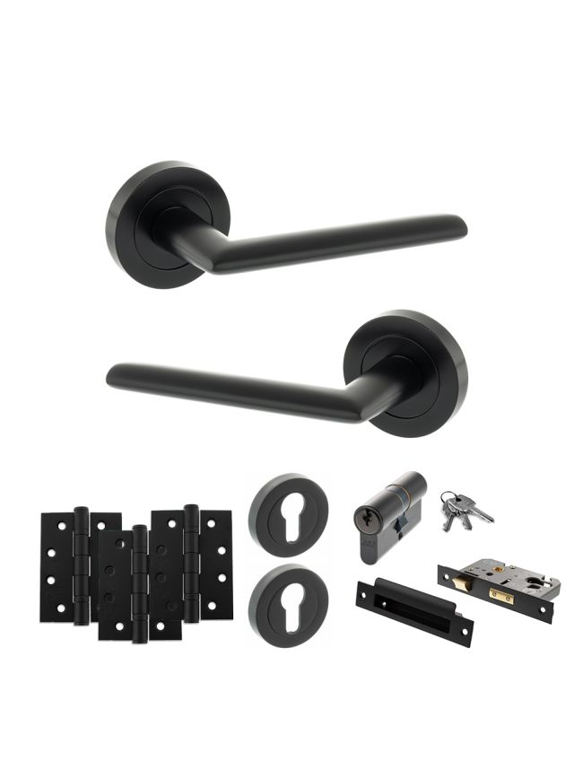 STATUS Alabama Door Handle Pack (Euro Lock Set - 3" CE Sashlock, 4" Fire Rated Hinges x3) - Matt Black