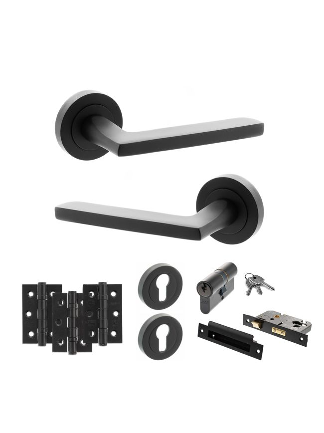 STATUS Alaska Door Handle Pack (Euro Lock Set - 2.5" CE Sashlock, 3" Fire Rated Hinges x3) - Matt Black
