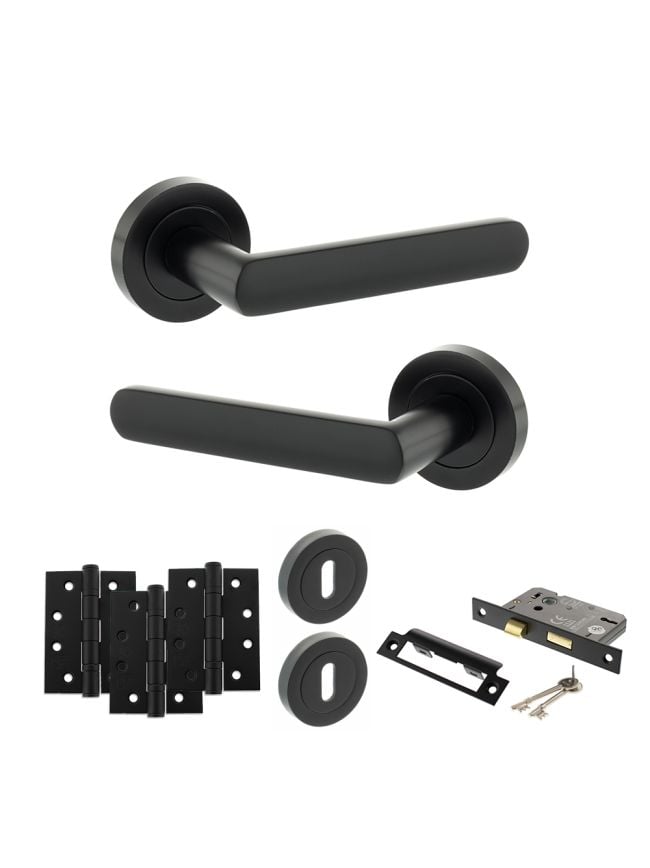 STATUS Carolina Door Handle Pack (3 Lever Lock Set - 2.5" CE Sashlock, 4" Fire Rated Hinges x3) - Matt Black