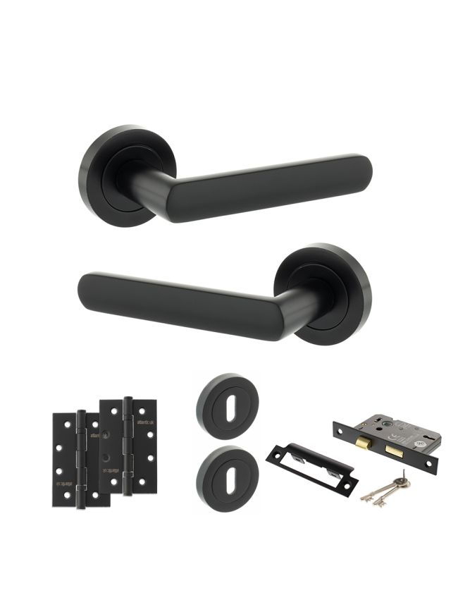 STATUS Carolina Door Handle Pack (3 Lever Lock Set - 2.5" CE Sashlock, 4" Slim Knuckle Hinges x2) - Matt Black