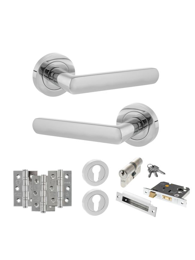 STATUS Carolina Door Handle Pack (Euro Lock Set - 3" CE Sashlock, 3" Fire Rated Hinges x3) - Polished Chrome