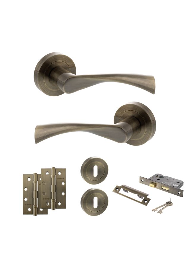 STATUS Colorado Door Handle Pack (3 Lever Lock Set - 2.5" CE Sashlock, 4" Slim Knuckle Hinges x2) - Antique Brass